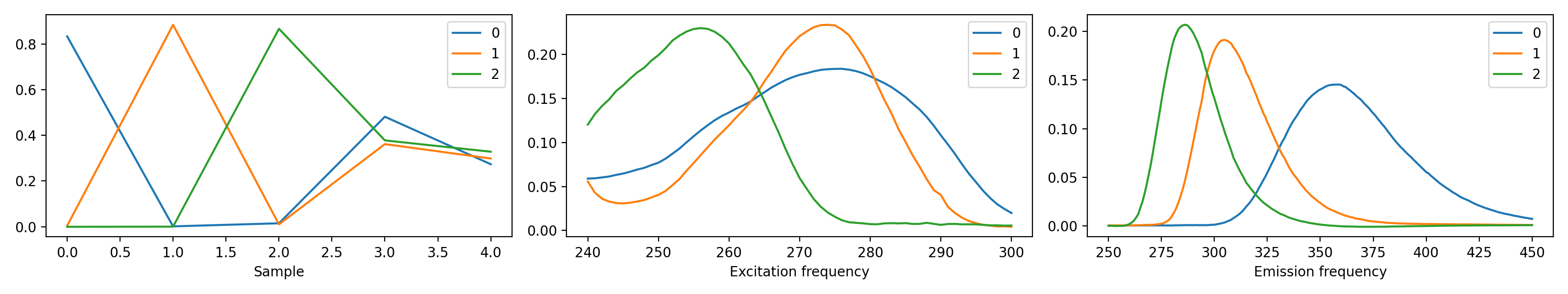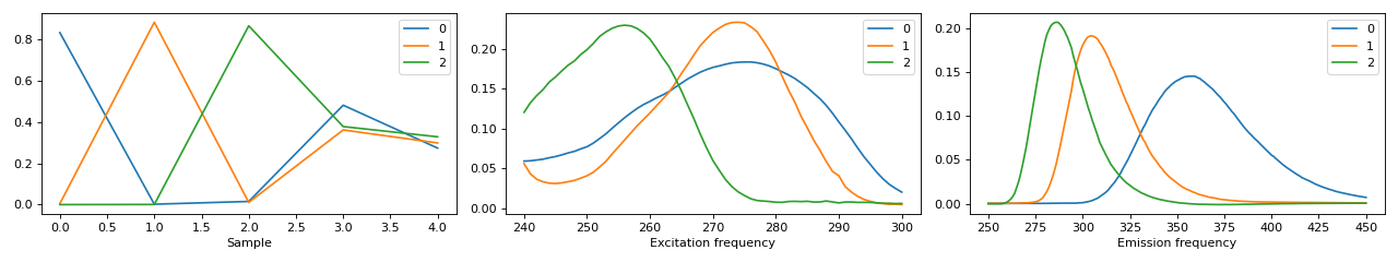 >>> import tlviz >>> import numpy as np >>> import matplotlib.pyplot as plt >>> from tensorly.decomposition import parafac >>> dataset = tlviz.data.load_aminoacids() Loading Aminoacids dataset from: Bro, R, PARAFAC: Tutorial and applications, Chemometrics and Intelligent Laboratory Systems, 1997, 38, 149-171