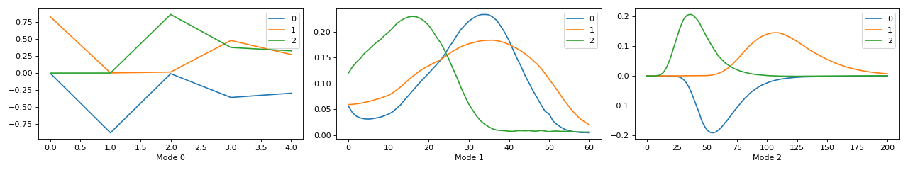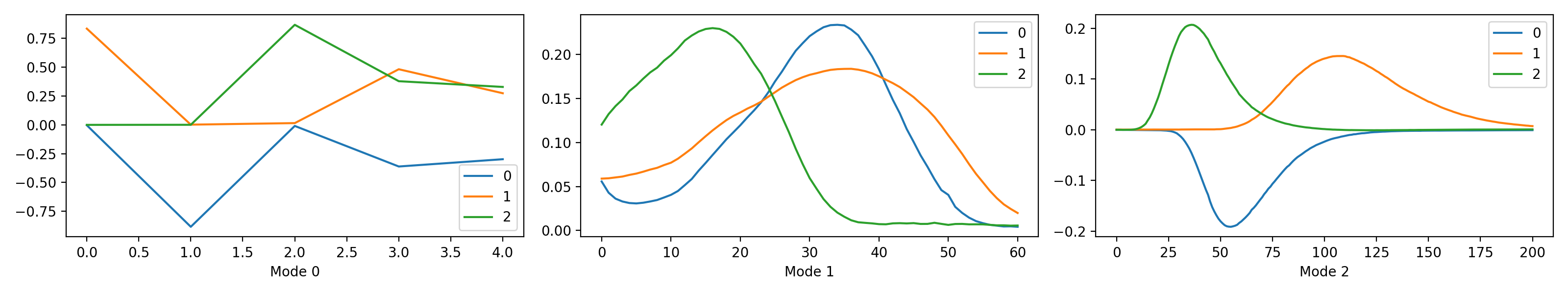 The visualisation of the postprocessed cp_tensor shows that the scaling and sign indeterminacy is taken care of and x-xaxis has correct labels and ticks
