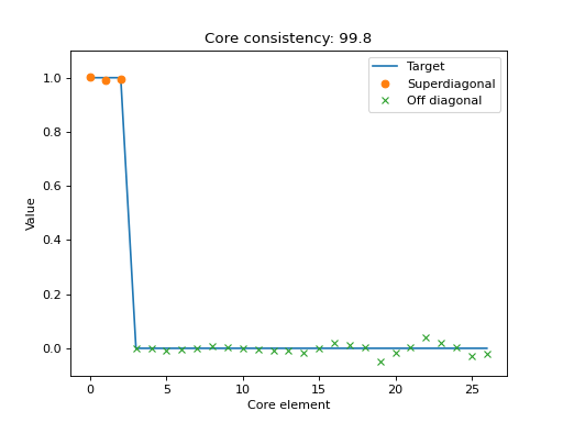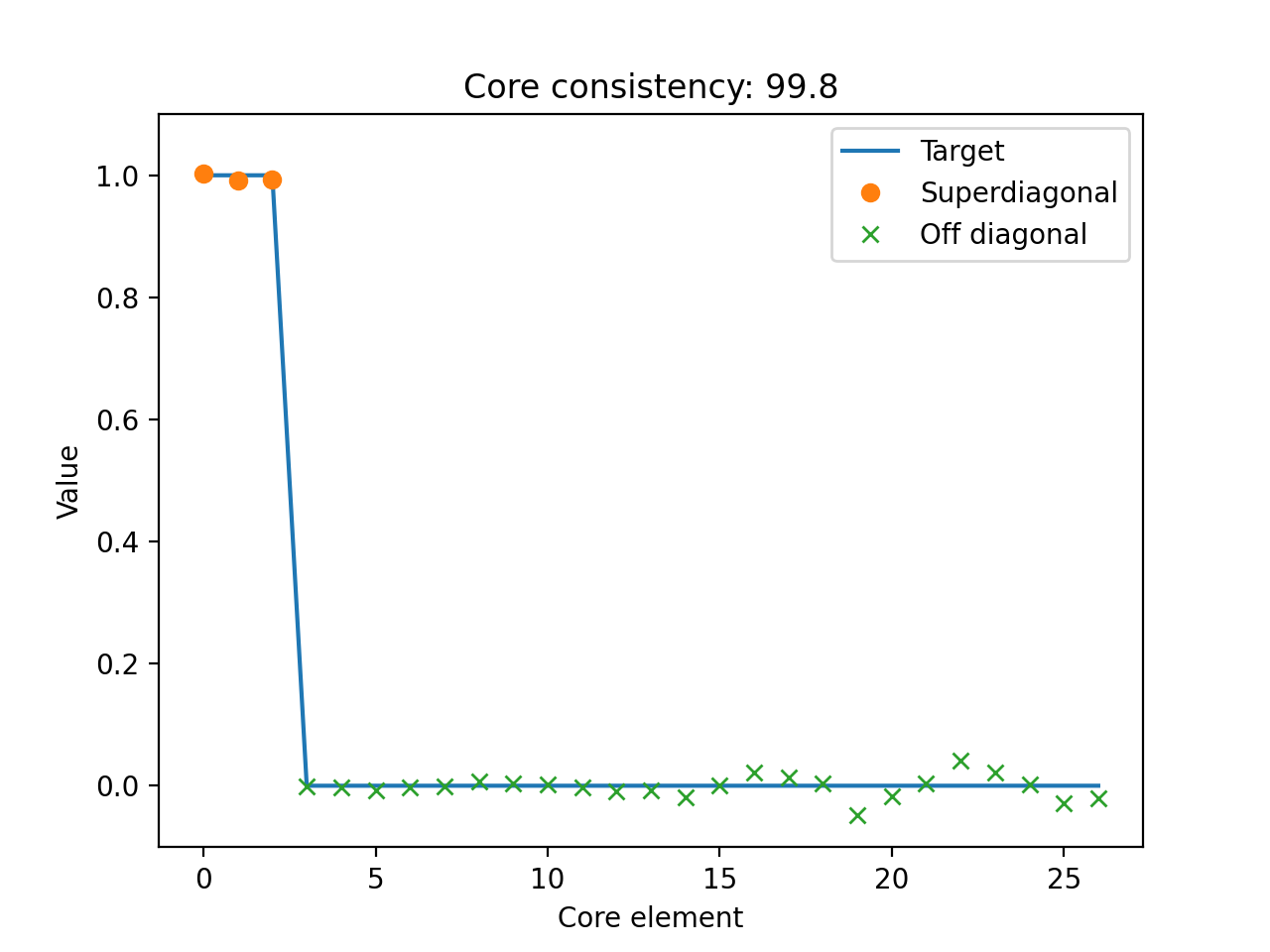 >>> import matplotlib.pyplot as plt >>> from tensorly.decomposition import parafac >>> from tlviz.data import simulated_random_cp_tensor >>> from tlviz.visualisation import core_element_plot >>> true_cp, X = simulated_random_cp_tensor((10, 20, 30), 3, seed=42) >>> est_cp = parafac(X, 3) >>> core_element_plot(est_cp, X) <Axes: title={'center': 'Core consistency: 99.8'}, xlabel='Core element', ylabel='Value'> >>> plt.show()