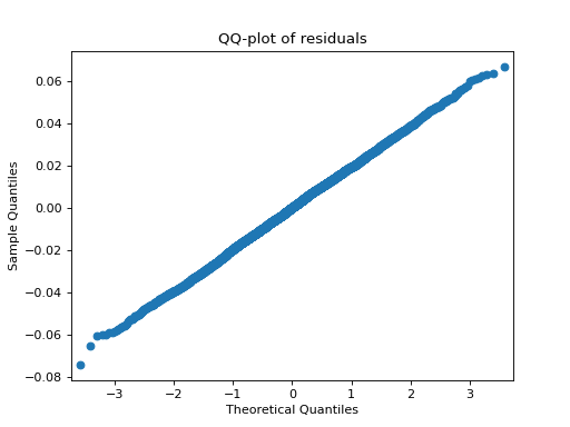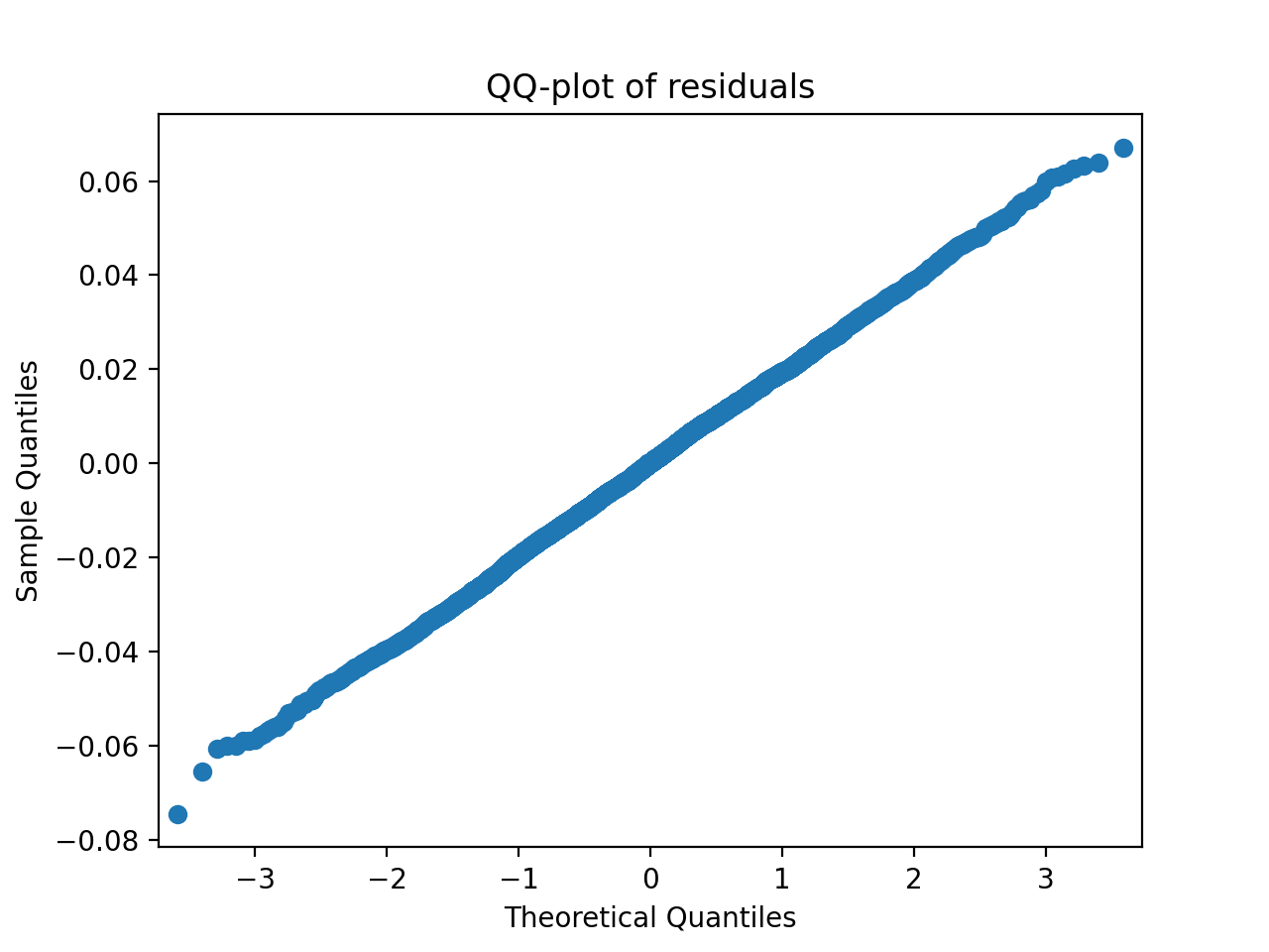 >>> import matplotlib.pyplot as plt >>> from tensorly.decomposition import parafac >>> from tlviz.data import simulated_random_cp_tensor >>> from tlviz.visualisation import residual_qq >>> true_cp, X = simulated_random_cp_tensor((10, 20, 30), 3, seed=0) >>> est_cp = parafac(X, 3) >>> residual_qq(est_cp, X) <Axes: title={'center': 'QQ-plot of residuals'}, xlabel='Theoretical Quantiles', ylabel='Sample Quantiles'> >>> plt.show()