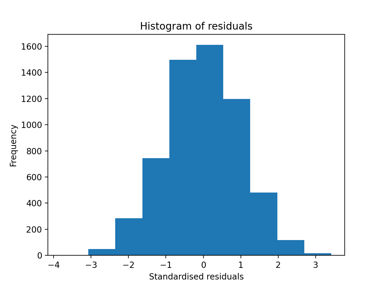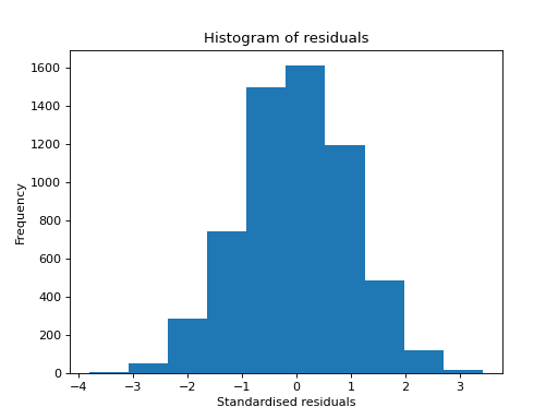 >>> import matplotlib.pyplot as plt >>> from tensorly.decomposition import parafac >>> from tlviz.data import simulated_random_cp_tensor >>> from tlviz.visualisation import histogram_of_residuals >>> true_cp, X = simulated_random_cp_tensor((10, 20, 30), 3, seed=0) >>> est_cp = parafac(X, 3) >>> histogram_of_residuals(est_cp, X) <Axes: title={'center': 'Histogram of residuals'}, xlabel='Standardised residuals', ylabel='Frequency'> >>> plt.show()