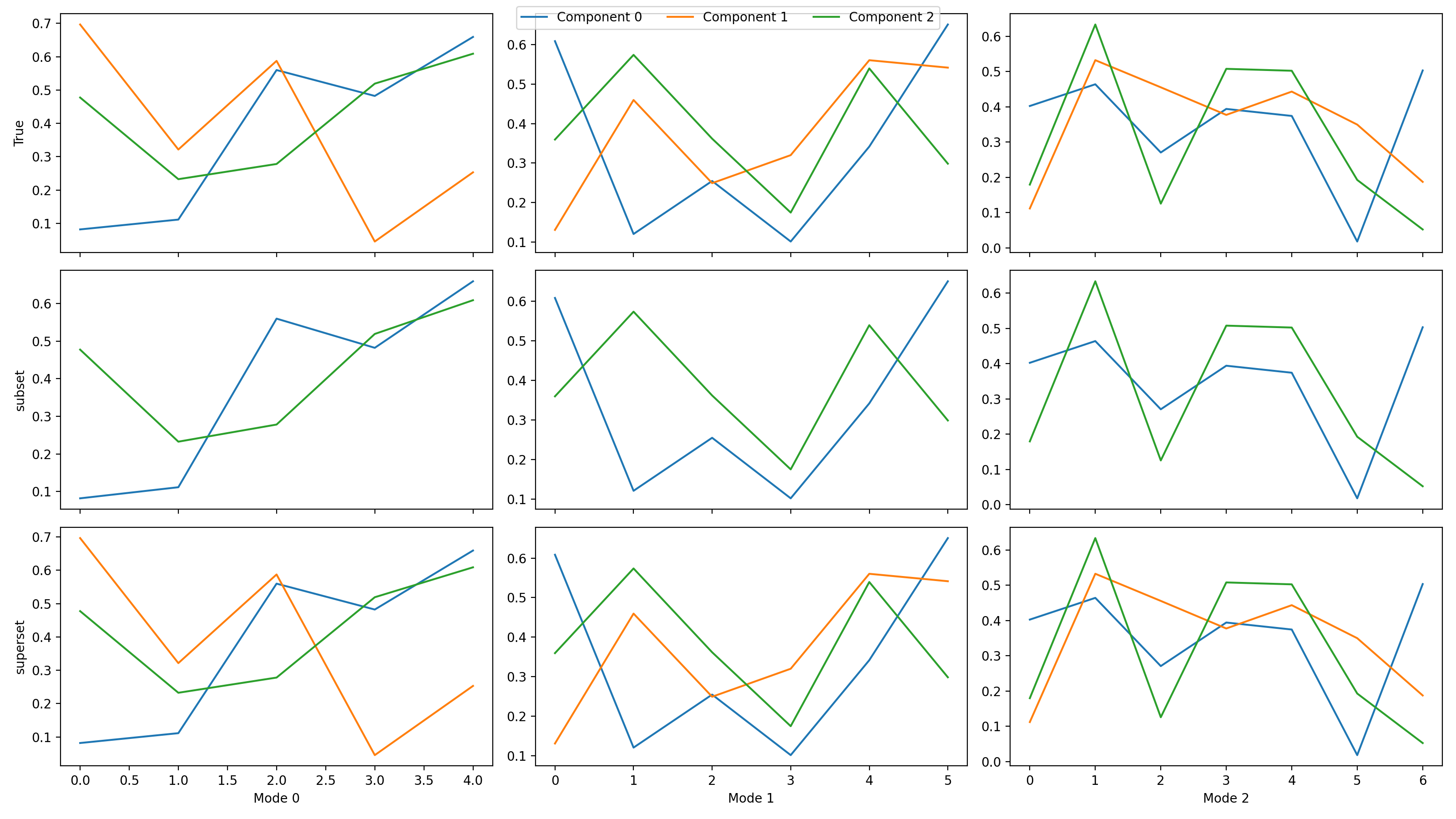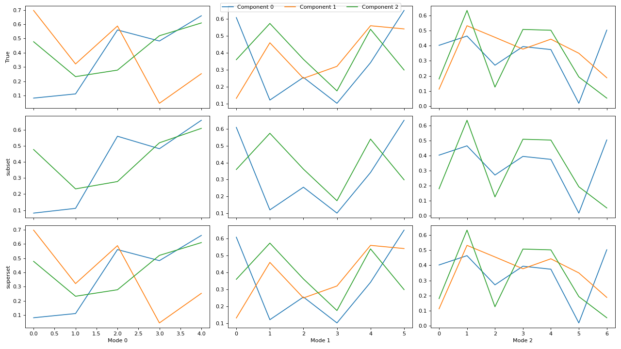cp_tensors-dictionary. If one of the subsequent decompositions have fewer components than the reference decomposition, then the columns will be aligned correctly, and if one of them has more, then the additional components will be ignored.>>> import matplotlib.pyplot as plt >>> from tlviz.data import simulated_random_cp_tensor >>> from tlviz.factor_tools import permute_cp_tensor >>> from tlviz.postprocessing import postprocess >>> from tlviz.visualisation import component_comparison_plot >>> >>> four_components = simulated_random_cp_tensor((5, 6, 7), 4, noise_level=0.5, seed=42)[0] >>> three_components = permute_cp_tensor(four_components, permutation=[0, 1, 2]) >>> two_components = permute_cp_tensor(four_components, permutation=[0, 2]) >>> # Plot the decomposition >>> cp_tensors = { ... "True": three_components, # Reference decomposition ... "subset": two_components, # Only component 0 and 2 ... "superset": four_components, # All components in reference plus one additional ... } >>> fig, axes = component_comparison_plot(cp_tensors, row="model") >>> plt.show()