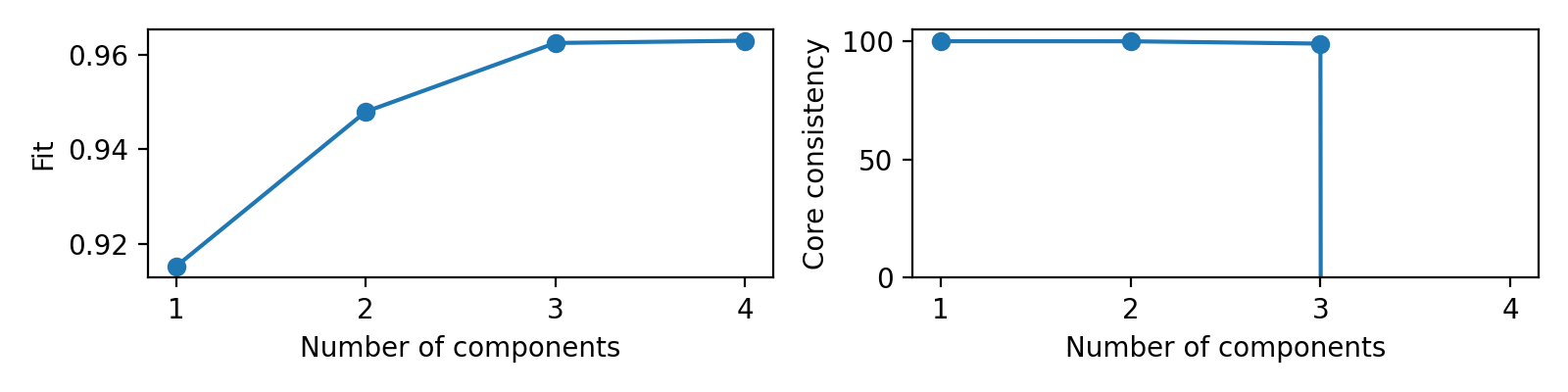 >>> from tlviz.data import simulated_random_cp_tensor >>> from tlviz.visualisation import scree_plot >>> import matplotlib.pyplot as plt >>> from tensorly.decomposition import parafac >>> >>> dataset = simulated_random_cp_tensor((10, 20, 30), rank=3, noise_level=0.2, seed=42)[1] >>> cp_tensors = {} >>> for rank in range(1, 5): ... cp_tensors[rank] = parafac(dataset, rank, random_state=1) >>> >>> fig, axes = plt.subplots(1, 2, figsize=(8, 2), tight_layout=True) >>> ax = scree_plot(cp_tensors, dataset, ax=axes[0]) >>> ax = scree_plot(cp_tensors, dataset, metric="Core consistency", ax=axes[1]) >>> # Names are converted to lowercase and spaces are converted to underlines when fetching metric-function, >>> # so "Core consistency" becomes getattr(tlviz.model_evaluation, "core_consistency") >>> >>> for ax in axes: ... xlabel = ax.set_xlabel("Number of components") ... xticks = ax.set_xticks(list(cp_tensors.keys())) >>> limits = axes[1].set_ylim((0, 105)) >>> plt.show()