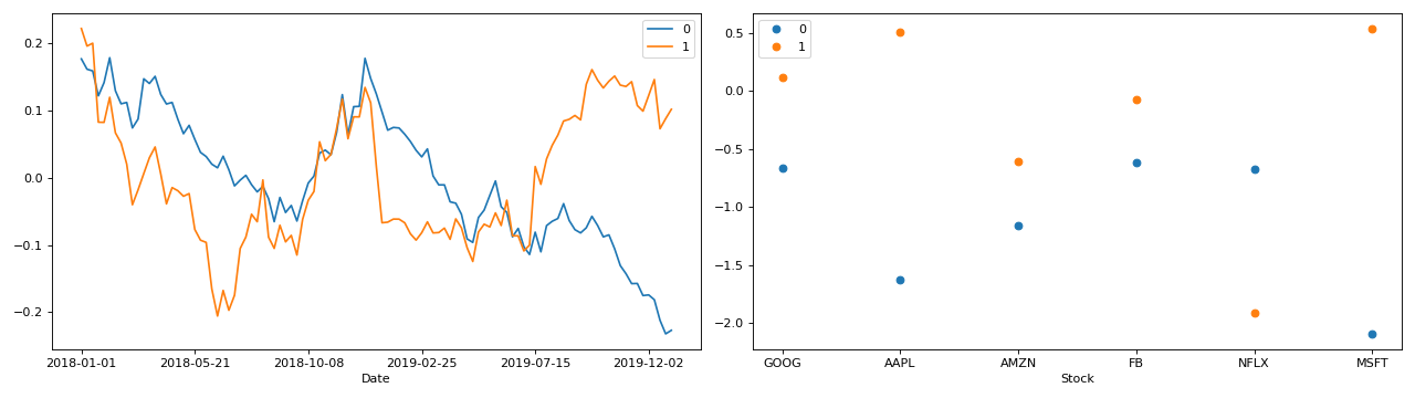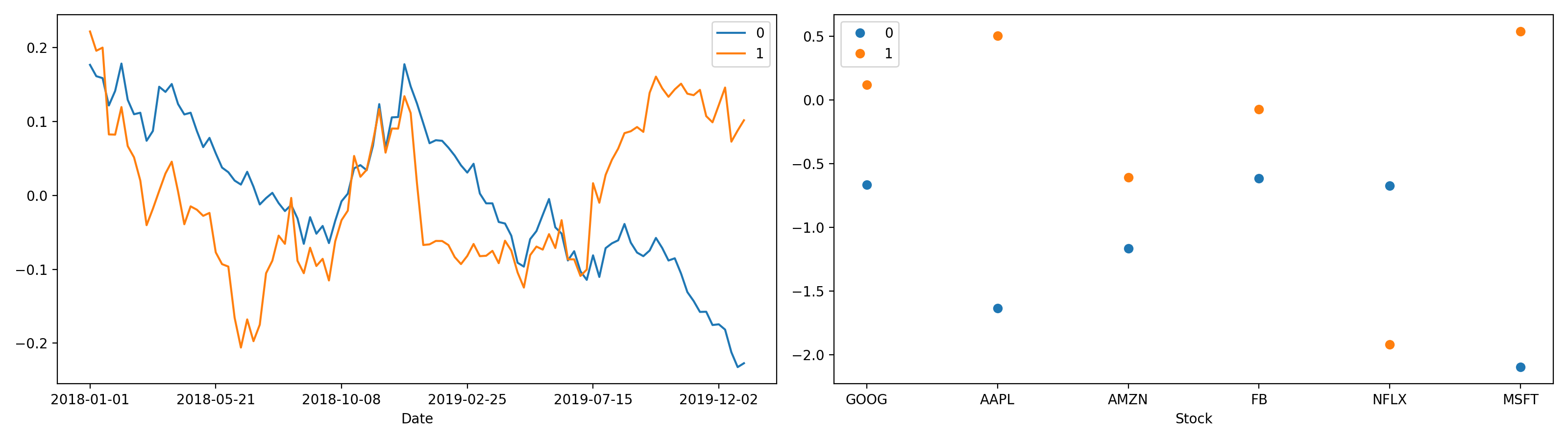 >>> import pandas as pd >>> import numpy as np >>> import matplotlib.pyplot as plt >>> import plotly.express as px >>> from tlviz.postprocessing import label_cp_tensor >>> from tlviz.visualisation import components_plot >>> >>> # Load data and convert to xarray >>> stocks = px.data.stocks().set_index("date").stack() >>> stocks.index.names = ["Date", "Stock"] >>> stocks = stocks.to_xarray() >>> >>> # Compute PCA via SVD of centered data >>> stocks -= stocks.mean(axis=0) >>> U, s, Vh = np.linalg.svd(stocks, full_matrices=False) >>> >>> # Extract two components and convert to cp_tensor >>> num_components = 2 >>> cp_tensor = s[:num_components], (U[:, :num_components], Vh.T[:, :num_components]) >>> cp_tensor = label_cp_tensor(cp_tensor, stocks) >>> >>> # Visualise the components with components_plot >>> fig, axes = components_plot(cp_tensor, weight_behaviour="one_mode", weight_mode=1, ... plot_kwargs=[{}, {'marker': 'o', 'linewidth': 0}]) >>> plt.show()
