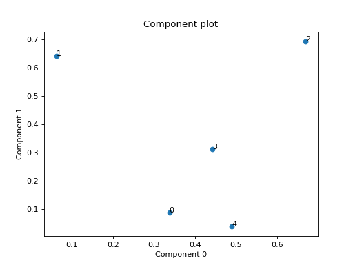 >>> from tensorly.random import random_cp >>> from tlviz.visualisation import component_scatterplot >>> import matplotlib.pyplot as plt >>> cp_tensor = random_cp(shape=(5,10,15), rank=2) >>> component_scatterplot(cp_tensor, mode=0) <Axes: title={'center': 'Component plot'}, xlabel='Component 0', ylabel='Component 1'> >>> plt.show()
