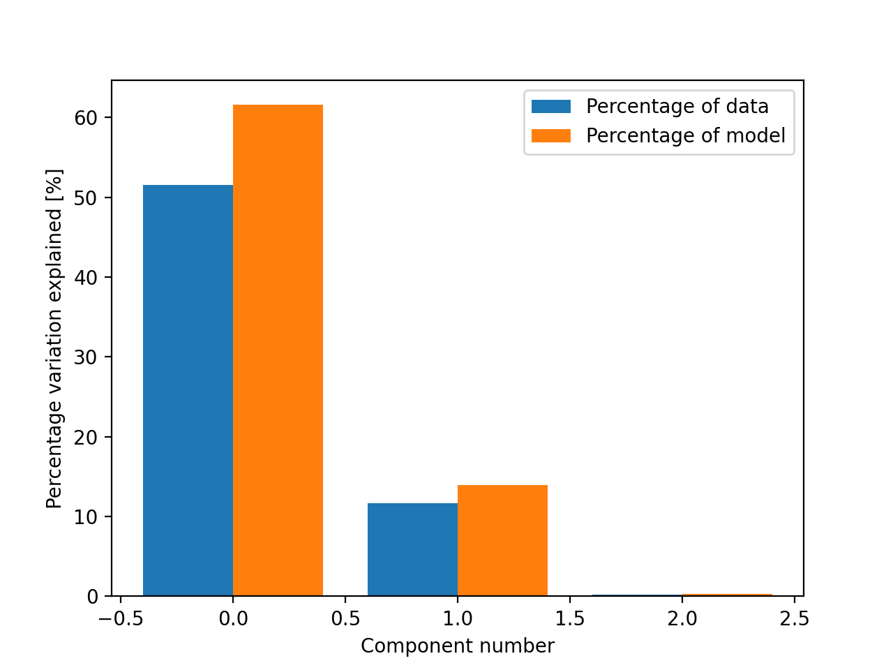 >>> from tlviz.visualisation import percentage_variation_plot >>> from tlviz.data import simulated_random_cp_tensor >>> import matplotlib.pyplot as plt >>> cp_tensor, dataset = simulated_random_cp_tensor(shape=(5,10,15), rank=3, noise_level=0.5, seed=0) >>> percentage_variation_plot(cp_tensor, dataset, method="both") <Axes: xlabel='Component number', ylabel='Percentage variation explained [%]'> >>> plt.show()