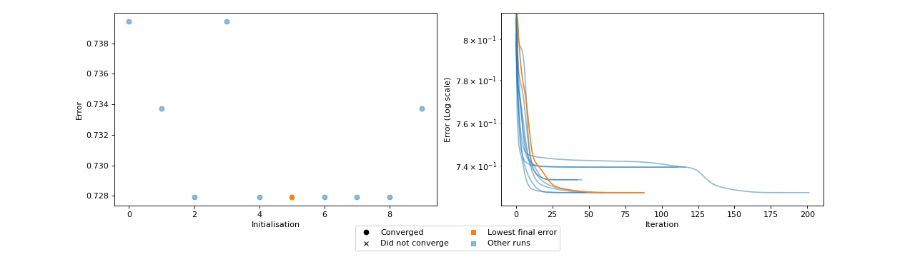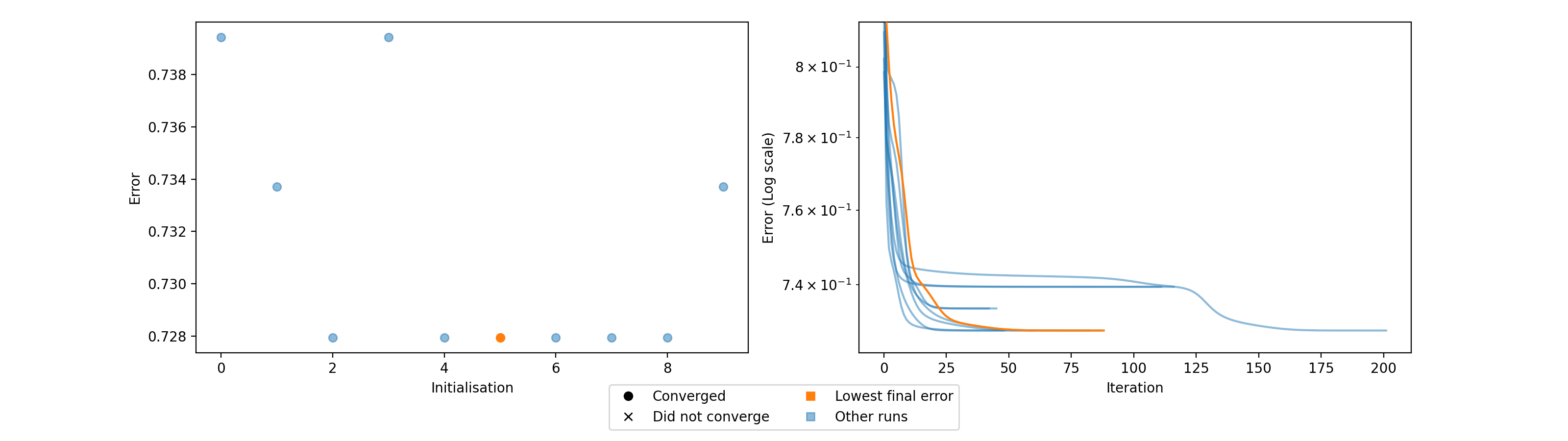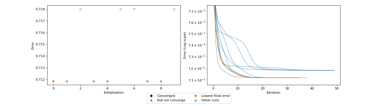 These plots can be helpful for understanding how stable the model is with respect to initialisation. Ideally, we should see that many initialisations converged and obtained the same, low, error. If models converge, but with different errors, then this can indicate that indicates that a stricter convergence tolerance is required, and if no models converge, then more iterations may be required.