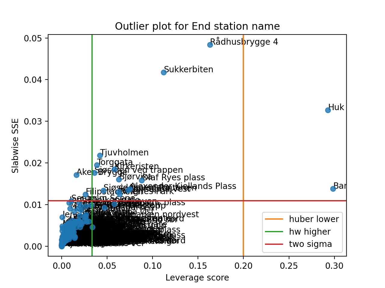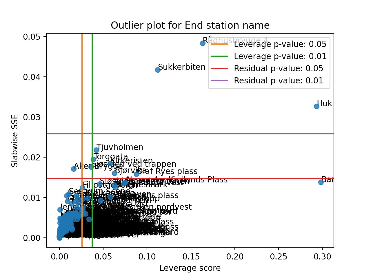 Detecting outliers can be a difficult task, and a common way to do this is by making a scatter-plot where the leverage score is plotted against the slabwise SSE (or residual).