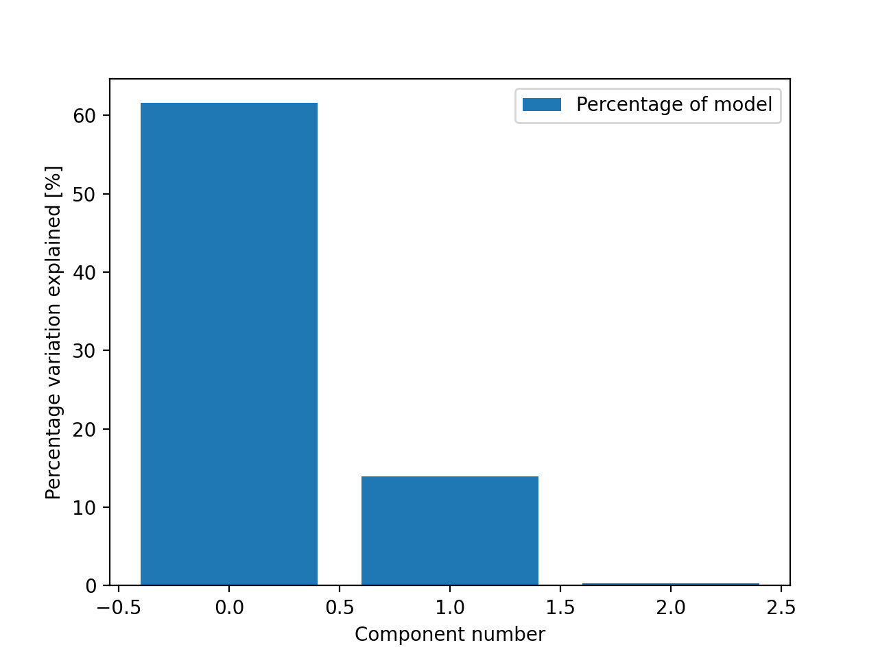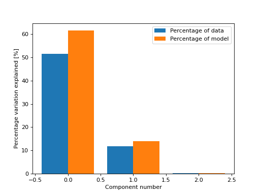 >>> from tlviz.visualisation import percentage_variation_plot >>> from tlviz.data import simulated_random_cp_tensor >>> import matplotlib.pyplot as plt >>> cp_tensor, dataset = simulated_random_cp_tensor(shape=(5,10,15), rank=3, noise_level=0.5, seed=0) >>> percentage_variation_plot(cp_tensor) <Axes: xlabel='Component number', ylabel='Percentage variation explained [%]'> >>> plt.show()