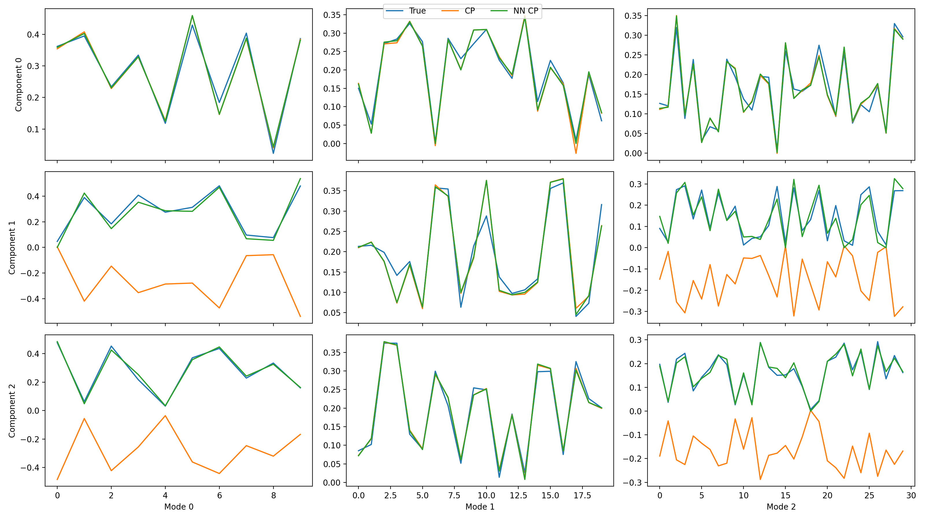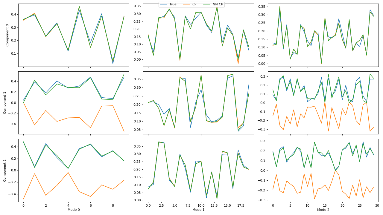 >>> import matplotlib.pyplot as plt >>> from tensorly.decomposition import parafac, non_negative_parafac_hals >>> from tlviz.data import simulated_random_cp_tensor >>> from tlviz.visualisation import component_comparison_plot >>> from tlviz.postprocessing import postprocess >>> >>> true_cp, X = simulated_random_cp_tensor((10, 20, 30), 3, noise_level=0.5, seed=42) >>> cp_tensors = { ... "True": true_cp, ... "CP": parafac(X, 3), ... "NN CP": non_negative_parafac_hals(X, 3), ... } >>> fig, axes = component_comparison_plot(cp_tensors, row="component") >>> plt.show()