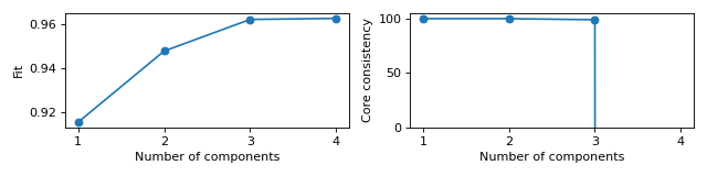 It can be useful look at the optimal core tensor for a given CP tensor. This can give valuable information about which components that are modelling multi-linear behaviour and which are not. For example, a component that models noise is more likely to have strong interactions with the other components compared to a component that have a meaningful interpretation. In the core element heatmap, this is shown as rows, columns and/or slabs that have high entries compared to the diagonal.