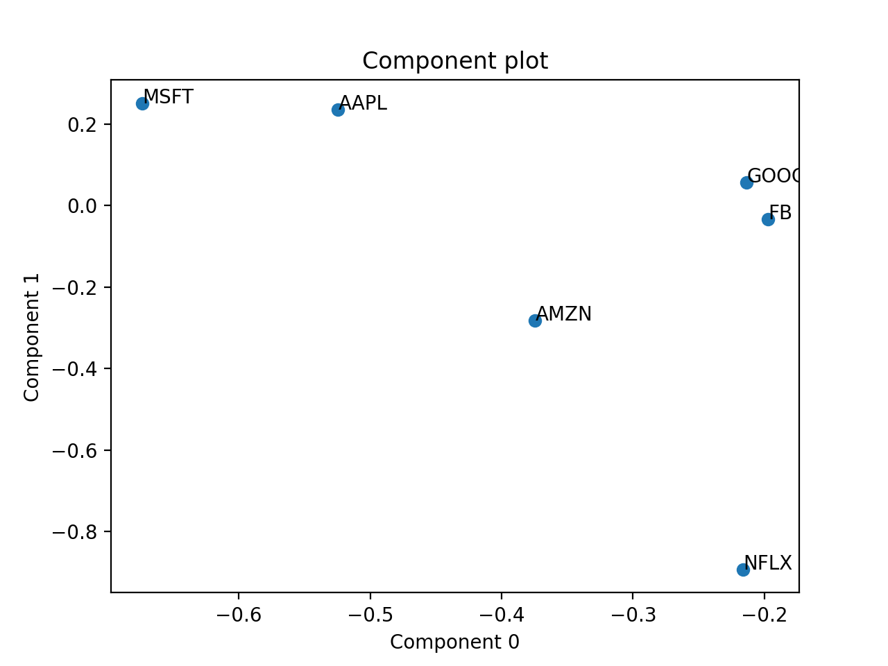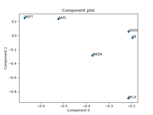 >>> import pandas as pd >>> import numpy as np >>> import matplotlib.pyplot as plt >>> import plotly.express as px >>> from tlviz.postprocessing import label_cp_tensor >>> from tlviz.visualisation import component_scatterplot >>> >>> # Load data and convert to xarray >>> stocks = px.data.stocks().set_index("date").stack() >>> stocks.index.names = ["Date", "Stock"] >>> stocks = stocks.to_xarray() >>> >>> # Compute PCA via SVD of centered data >>> stocks -= stocks.mean(axis=0) >>> U, s, Vh = np.linalg.svd(stocks, full_matrices=False) >>> >>> # Extract two components and convert to cp_tensor >>> num_components = 2 >>> cp_tensor = s[:num_components], (U[:, :num_components], Vh.T[:, :num_components]) >>> cp_tensor = label_cp_tensor(cp_tensor, stocks) >>> >>> # Visualise the components with components_plot >>> component_scatterplot(cp_tensor, mode=1) <Axes: title={'center': 'Component plot'}, xlabel='Component 0', ylabel='Component 1'> >>> plt.show()
