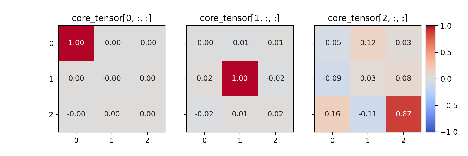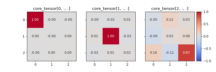 >>> from tlviz.visualisation import core_element_heatmap >>> from tlviz.data import simulated_random_cp_tensor >>> import matplotlib.pyplot as plt >>> cp_tensor, dataset = simulated_random_cp_tensor((20, 30, 40), 3, seed=0) >>> fig, axes = core_element_heatmap(cp_tensor, dataset) >>> plt.show()