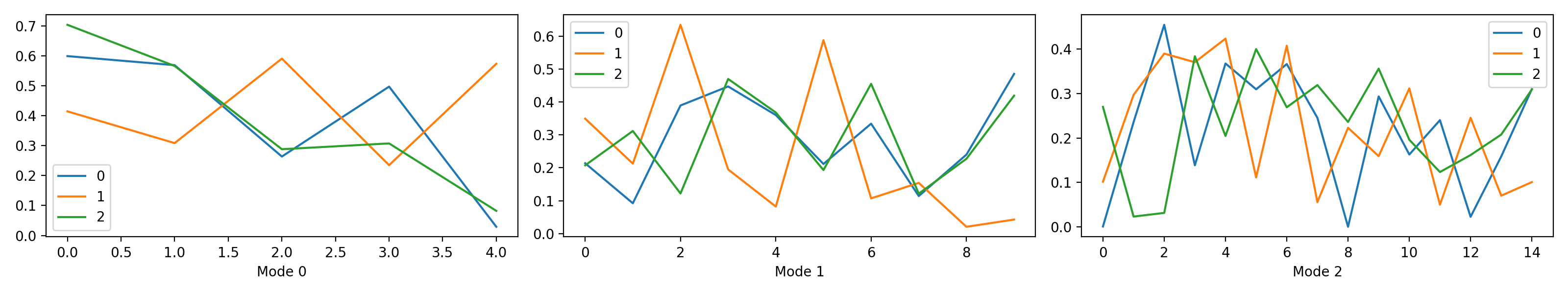 >>> from tensorly.random import random_cp >>> from tlviz.visualisation import components_plot >>> import matplotlib.pyplot as plt >>> cp_tensor = random_cp(shape=(5,10,15), rank=3) >>> fig, axes = components_plot(cp_tensor) >>> plt.show()